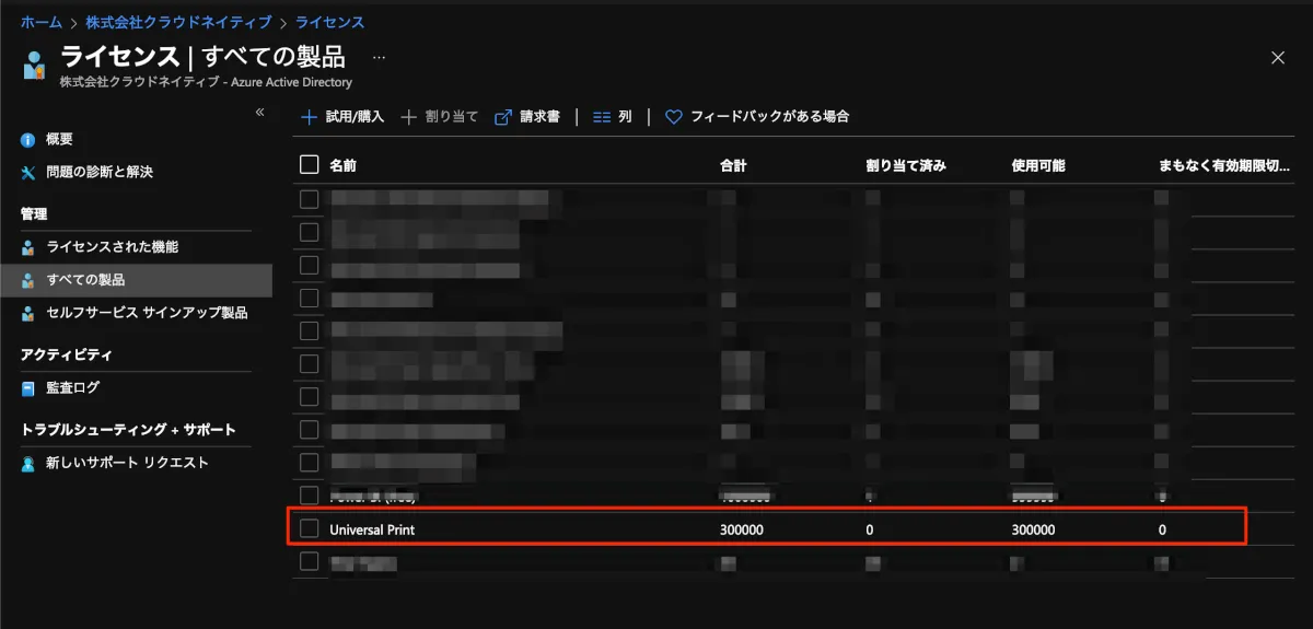- Universal Printの設定者と利用者にライセンスを付与しておきます。