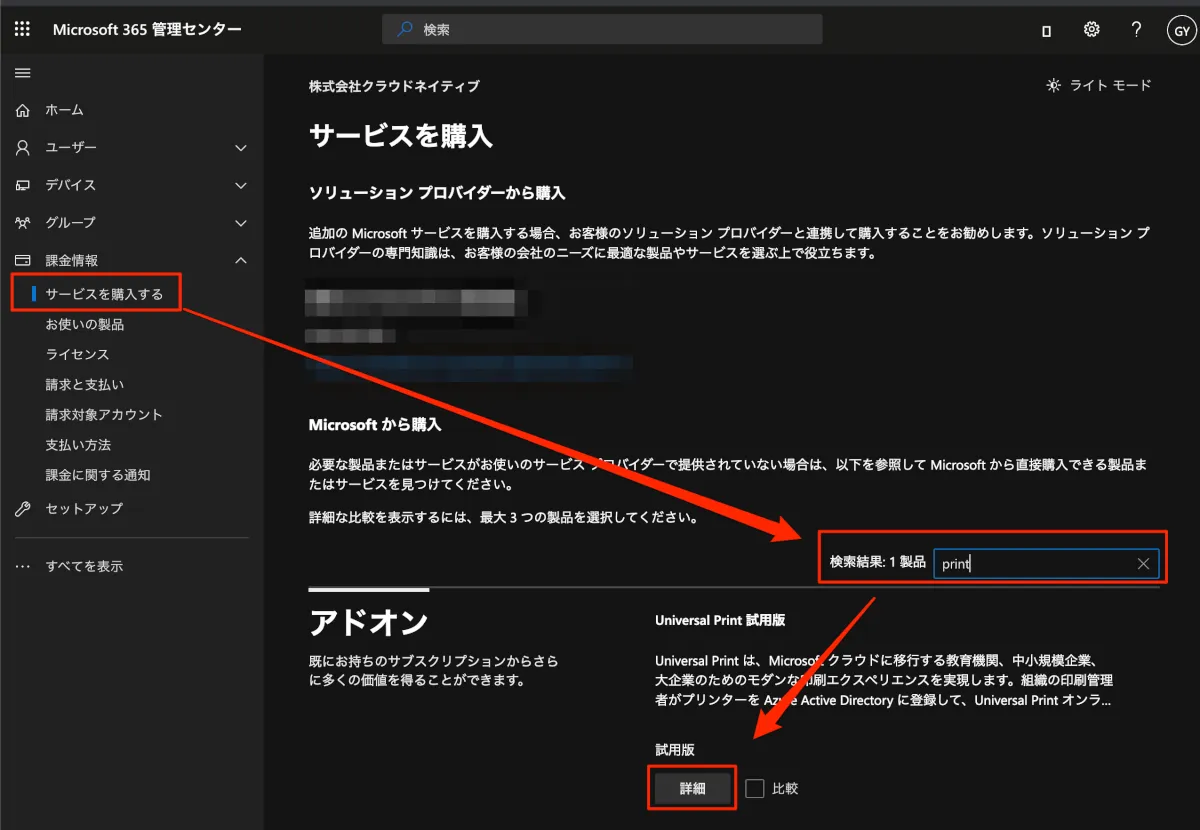 - [課金情報] – [サービスを購入する]を選択し、Universal Printを検索すると試用版が出てきます。