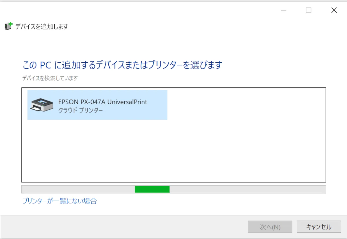 - 少し待つと、Universal Printで登録したプリンターが表示されるため、選択して次へを押します。