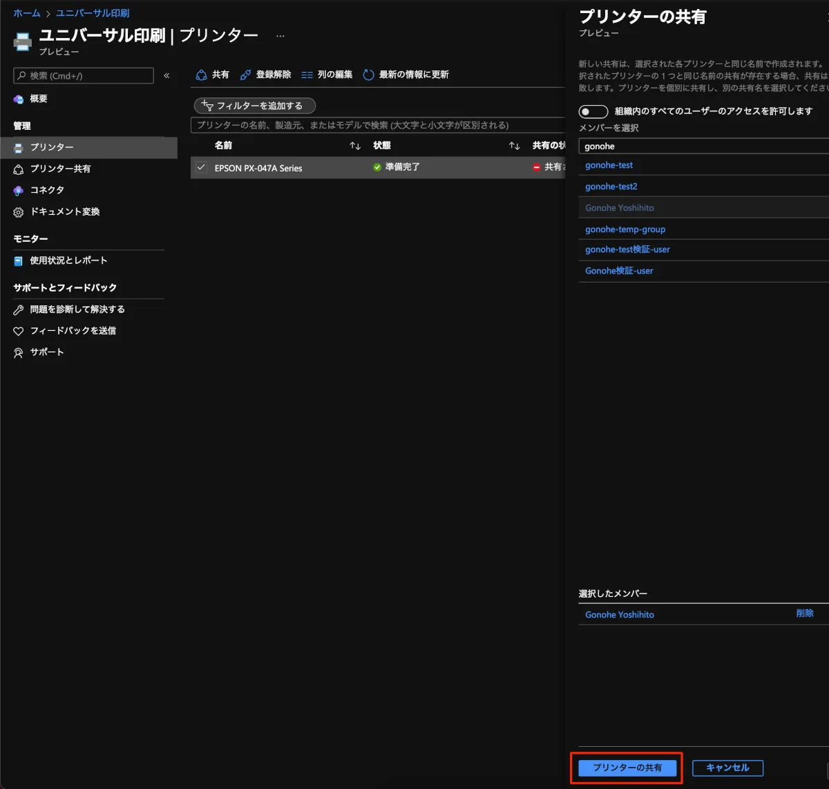 - 画面右でプリンターを共有するユーザもしくはグループを選択できるので、適宜選択してプリンターの共有を押します。