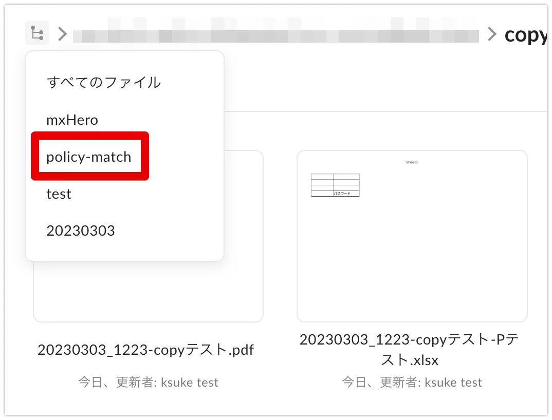 この例では、メール本文の”契約書”が、条件である”..書”にマッチするため、”policy-match”配下の”書類”フォルダにコピーされました。