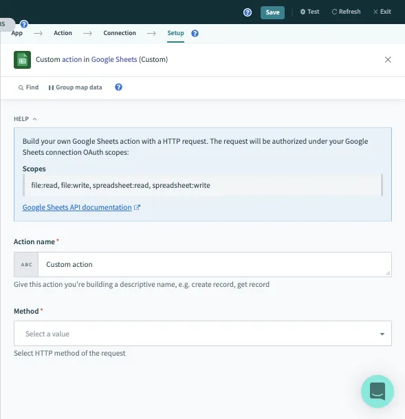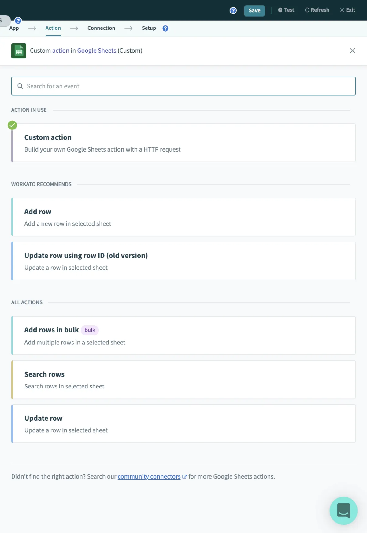 GoogleSheetsを追加してCustom Action をクリックします。