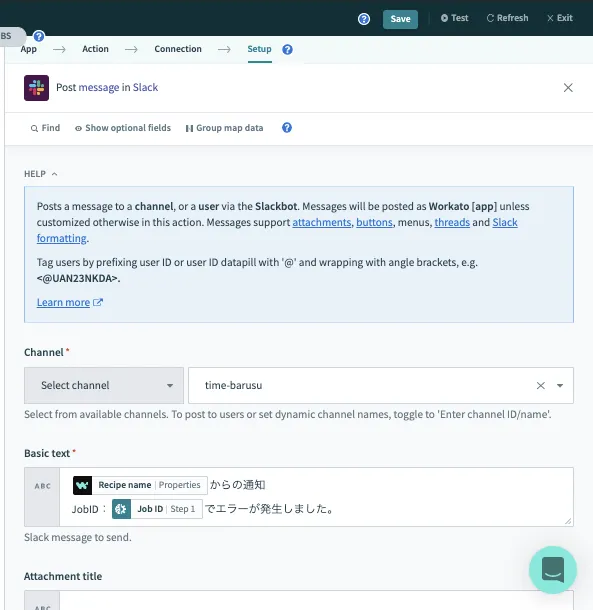 前のアクションの値を使ってSlackへの投稿文に入れ込むことができます。