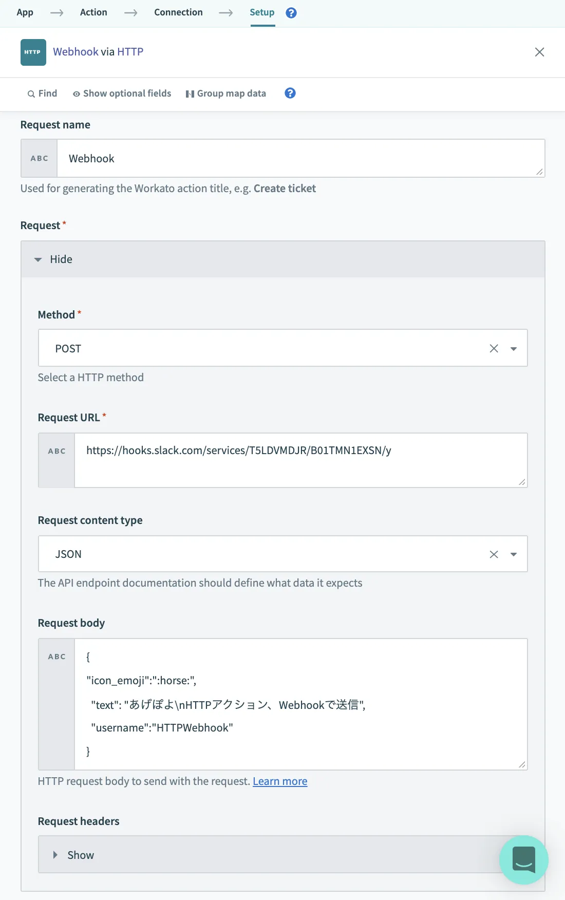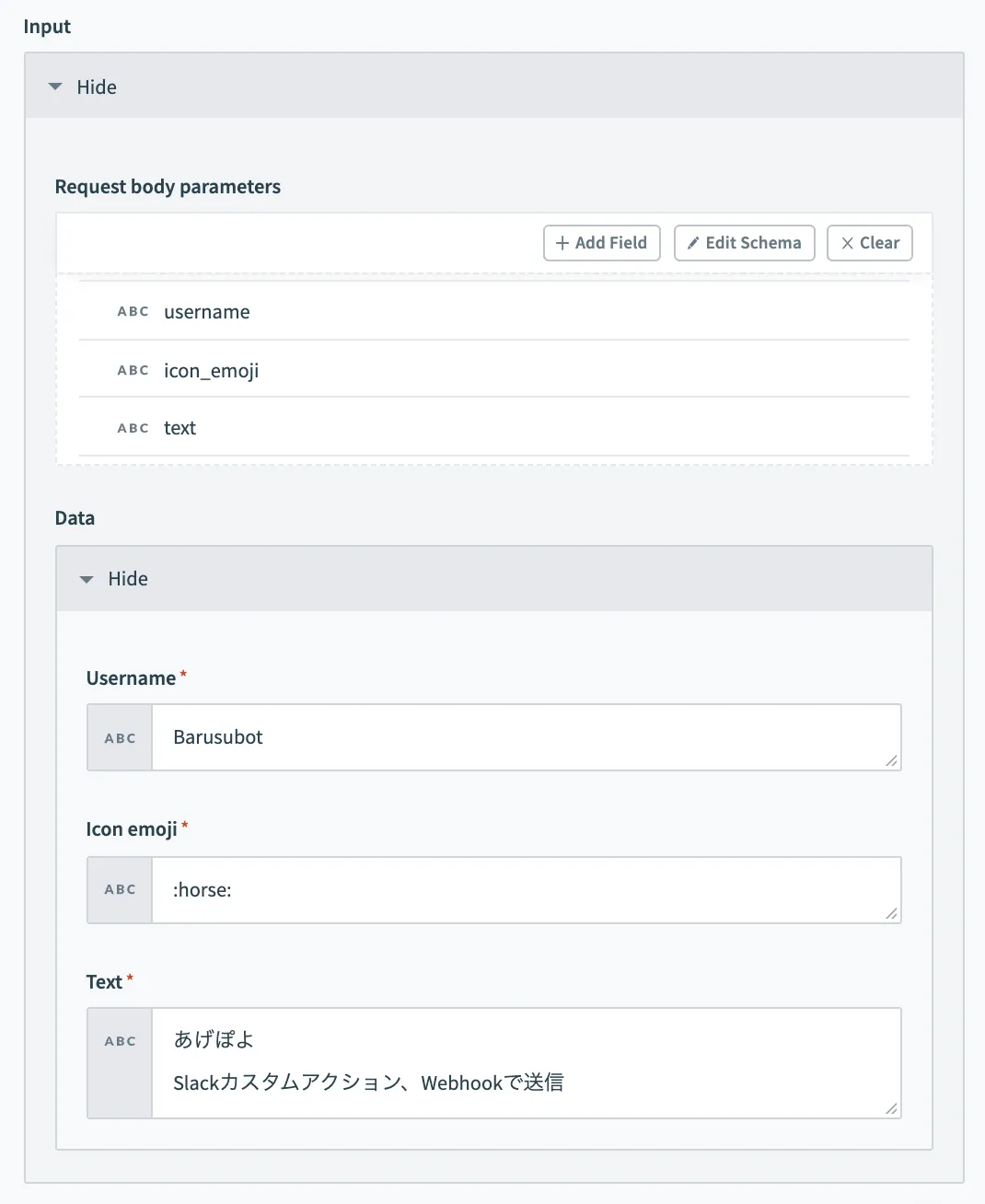 “text”: “あげぽよ\nHTTPアクション、Webhookで送信”,