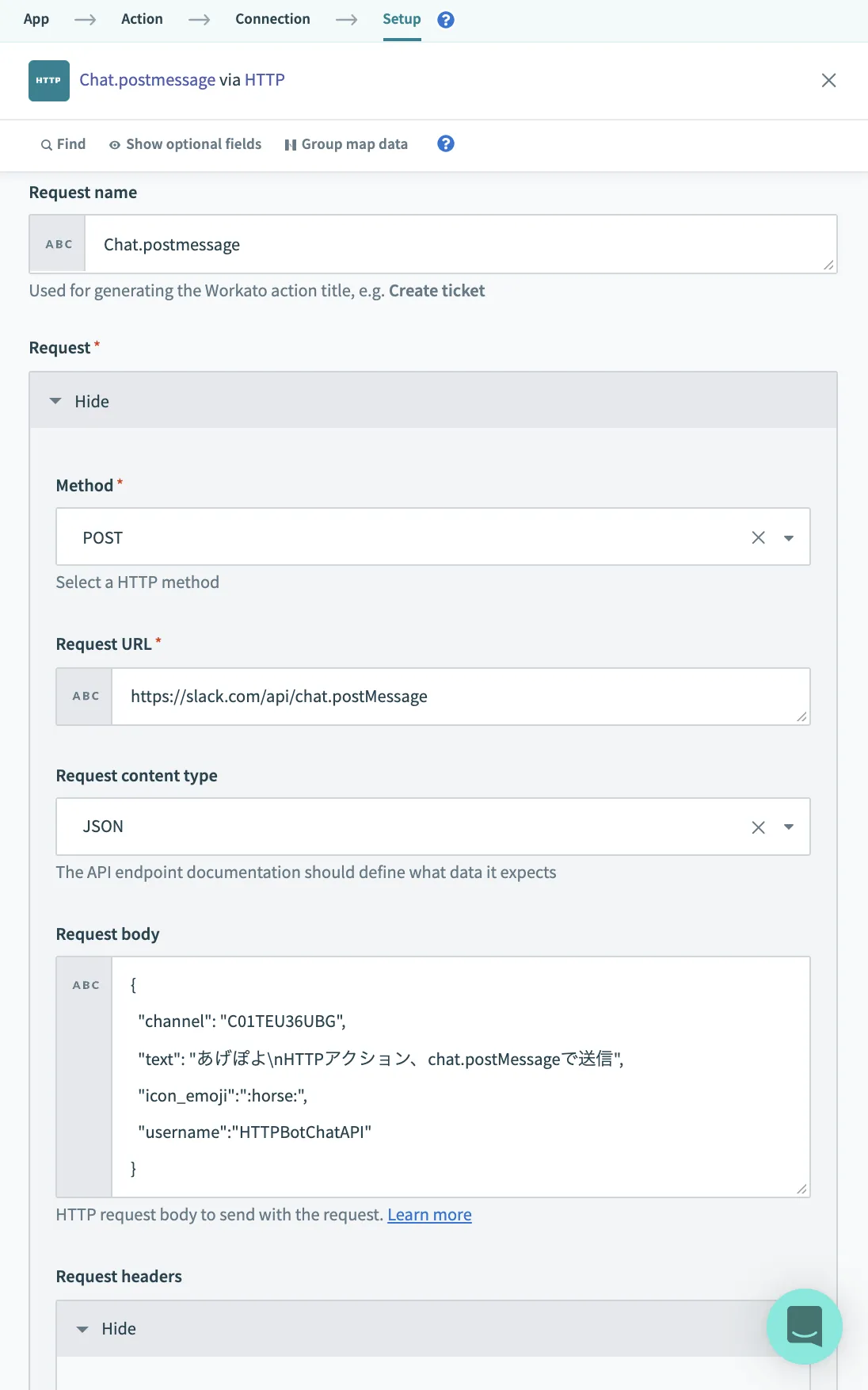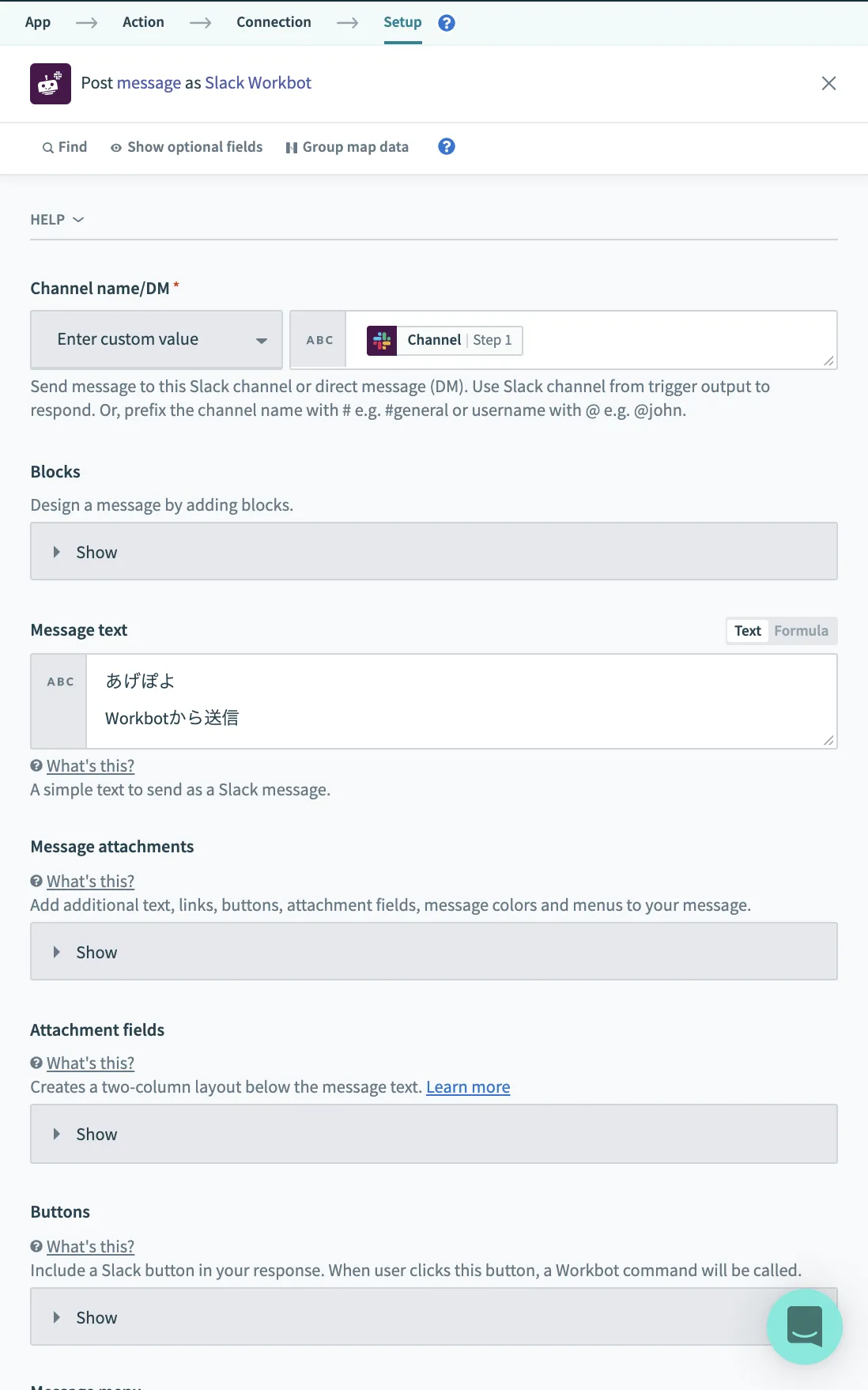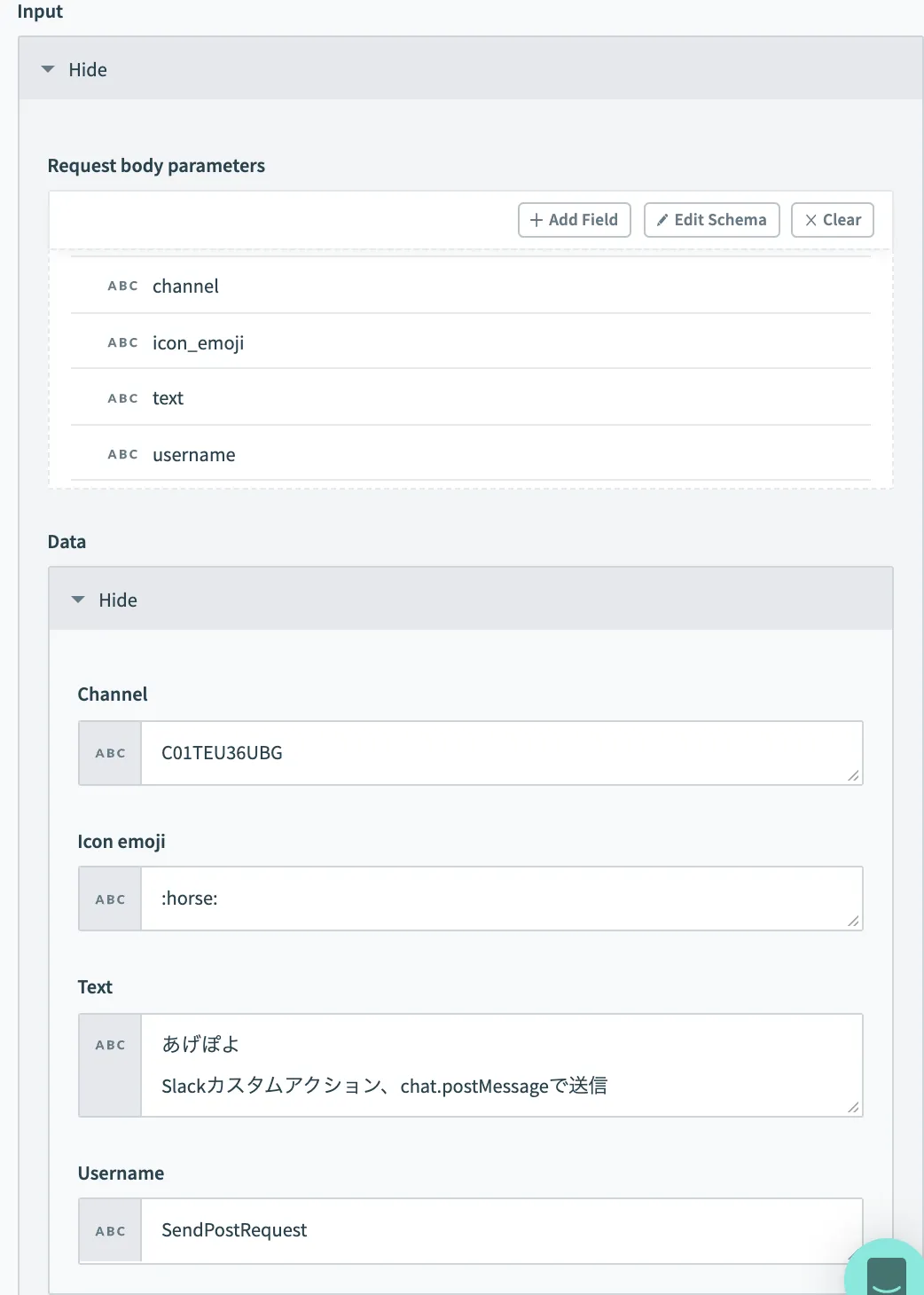 “text”: “あげぽよ\nHTTPアクション、chat.postMessageで送信”,