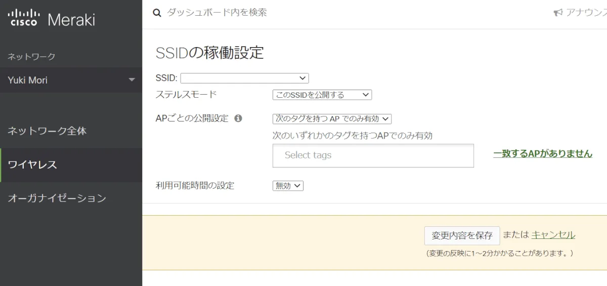 ダッシュボード上で作ったSSIDを、どのアクセスポイントで運用するか?を決めます。ダッシュボード上ですべての設定や管理が行えます。一般的なブロードバンドルーターのようにローカルネットワークでルーターにアクセスして管理画面場で設定を作成するのではなく、Merakiダッシュボード上で各種設定の作成を行い、作成した設定を配信すると、各APはネットワークを通じて設定を受け取り、設定通りに動くイメージです。