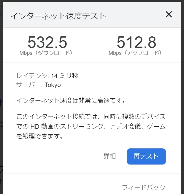 森家のネットワークは時間帯によって速度の波が大きい(200-700Mbpsくらい)ですが、測定したタイミングはかなり速い方でした。