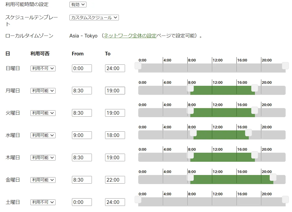 特定のSSIDの稼働時間を曜日別や時間別で細かく設定する事が出来るため、業務用Wi-Fi(SSID)の稼働時間を絞ったり、無効化させたりすることができます。