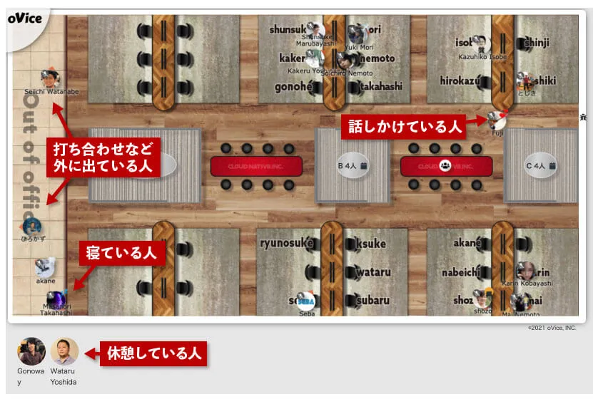 逆に席にいれば、ちょこっと話したいときに、気軽に近づいて(ここ重要)話しかけたりできるのがoViceのいいところで、そういうちょっとした会話で、さらにコミュニケーションが活発化するといいなーと思っています。