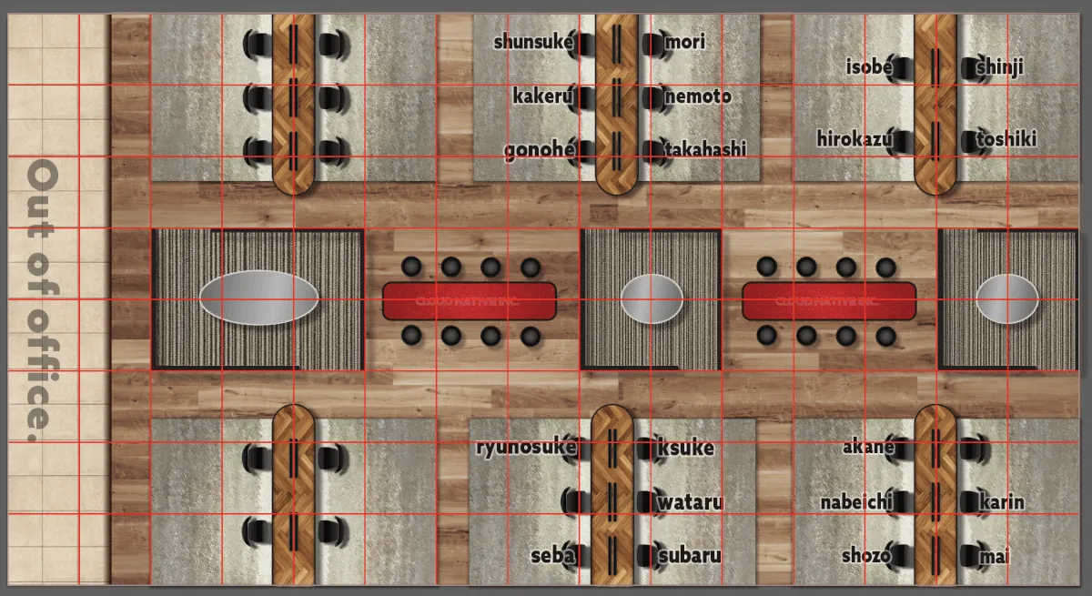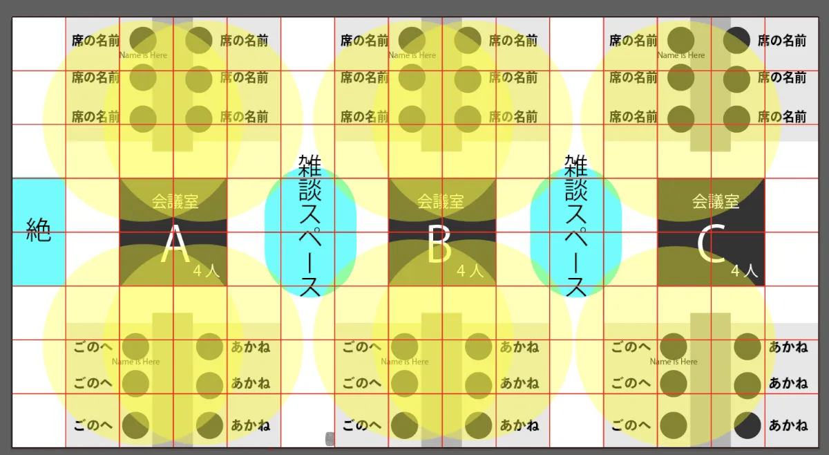 オフィスの設定にはコツがあり、oViceは80x80px単位のグリッドで構成されています。会議室のスペースは80x80pxのブロックの大きさに応じて会議室に入れる人数が決まるので、デザインをするときには80x80pxのグリッドガイドを作成すると、oVice側での設定もスムーズです!
