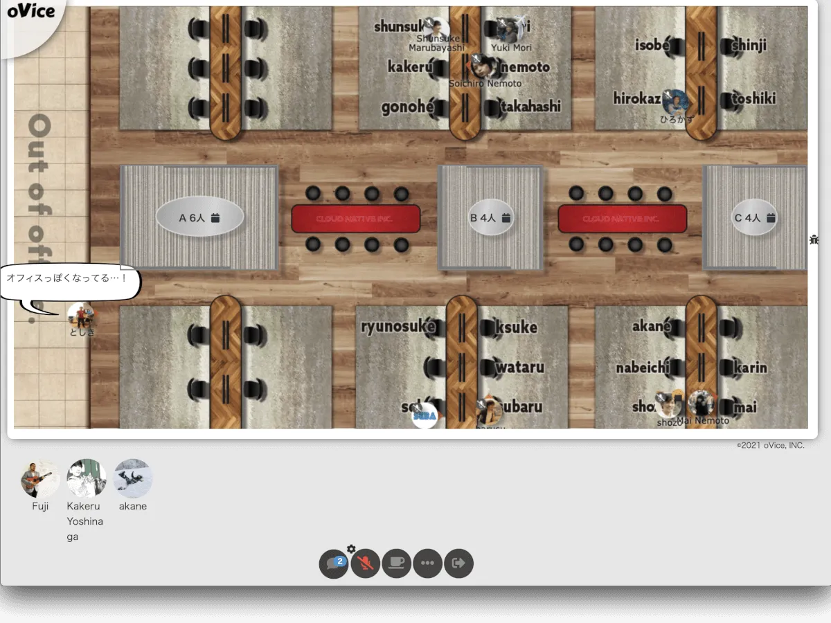 お客さんと会議しているときに、oViceから声が聞こえてきちゃったりとかはもちろんありますし、休憩ボタンの押し忘れや、ミュートしっぱなしとか、多々あると思います。まぁ、でもそこは実際のリアルオフィスとあんまり変わらなくて、そういう、繋がっているか繋がっていないか、聞こえるか聞こえないかの曖昧な感じがなんともオフィスらしいのかなって思います。