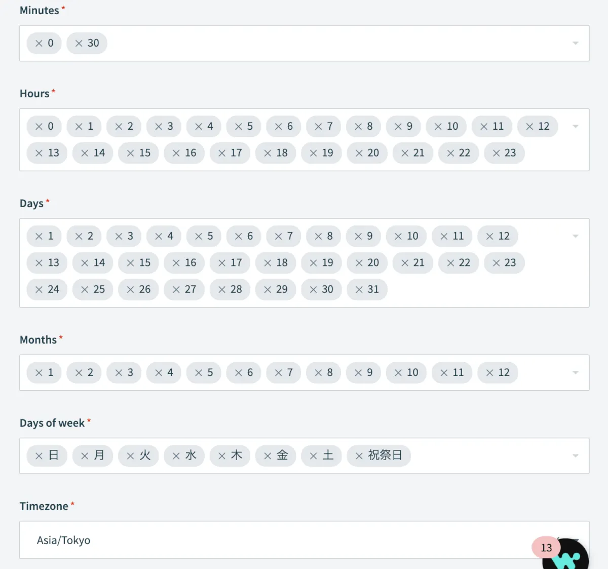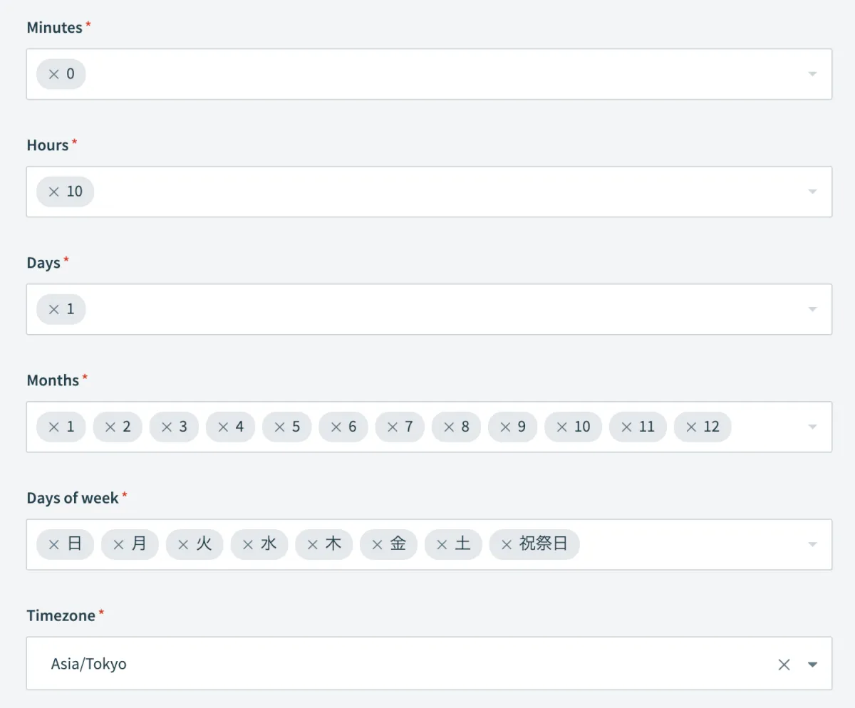 定期実行したい「月」「日」「時」「分」「曜日」を指定することで、その時間であるかどうかを判定できます。設定例を2つ載せてみます(cronの書き方を読んでみると習熟しやすいかもしれません)。