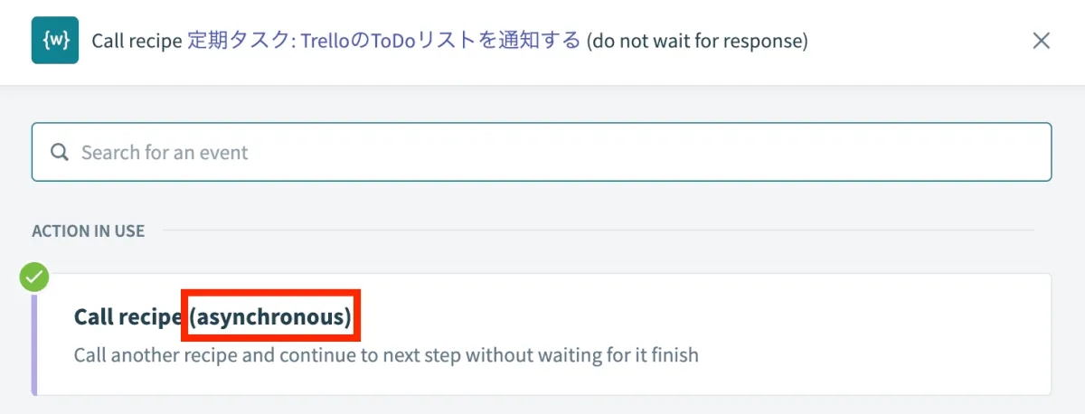 Callable Recipeを呼び出すときには必ず“unsynchronous”を選択します。こうすることで呼び出したレシピの結果を待たずに後続の処理へ移るので、複数の処理が被った場合にも遅延なく呼び出されます。