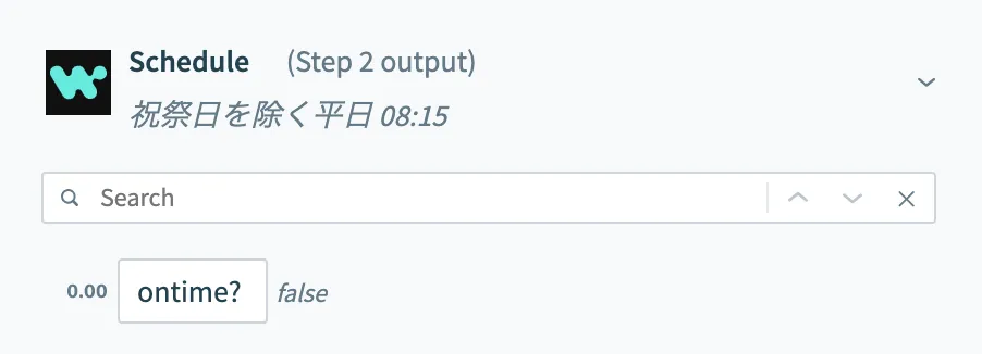 - 実行された時間が「祝祭日を除く平日の朝08:15」かどうか判定します(ステップ2)