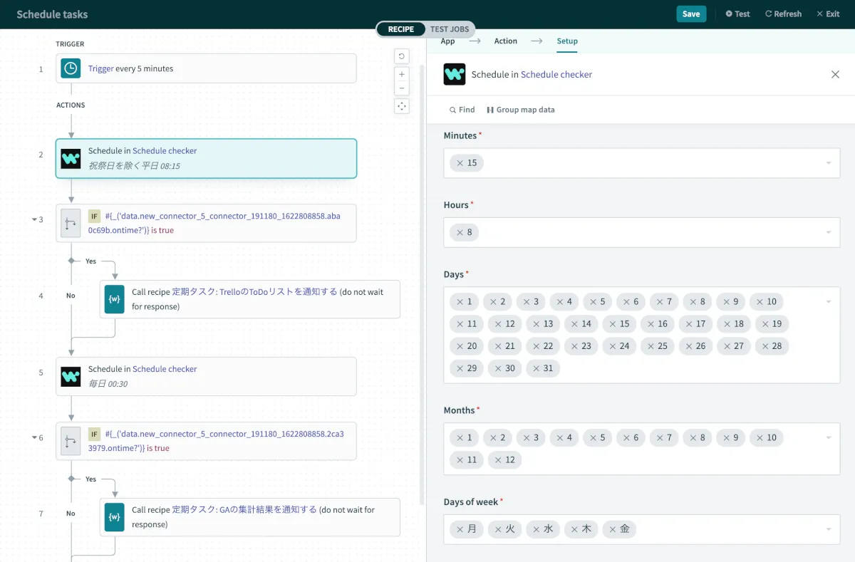 このレシピでは「祝祭日を除く平日の朝08:15にTrelloのToDoリストに通知する」「毎日00:30にGAの集計結果を通知する」の2つのタスクが設定されています。