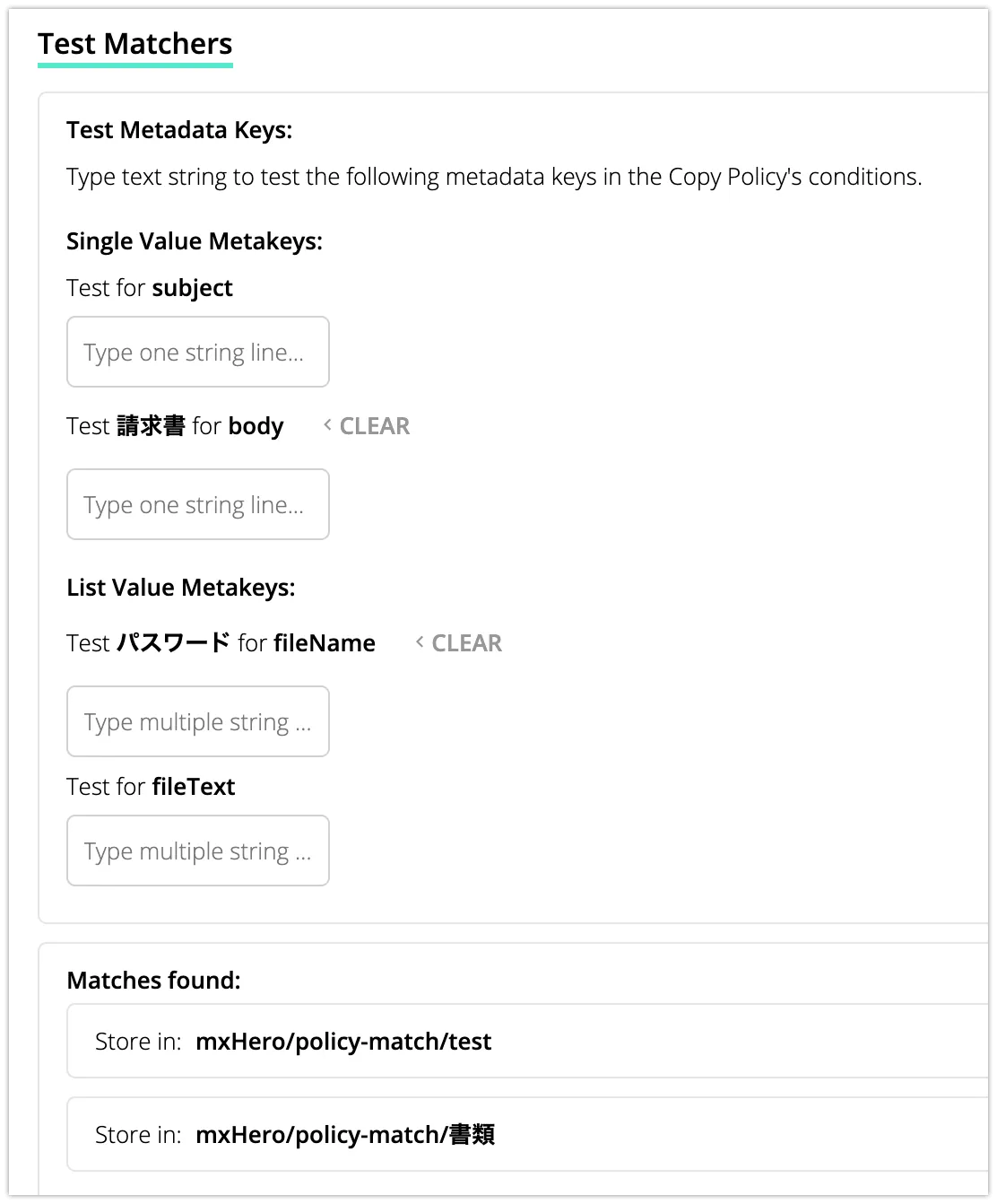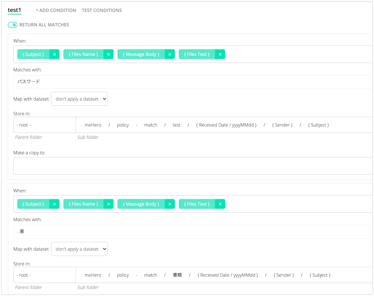 この場合は、”請求書”が”..書”にマッチするため、”書類”フォルダにコピーされることがわかります。なお、この例では、”RETURN ALL MATCHES”として設定しているため、以下の場合は2つのフォルダにコピーされます。