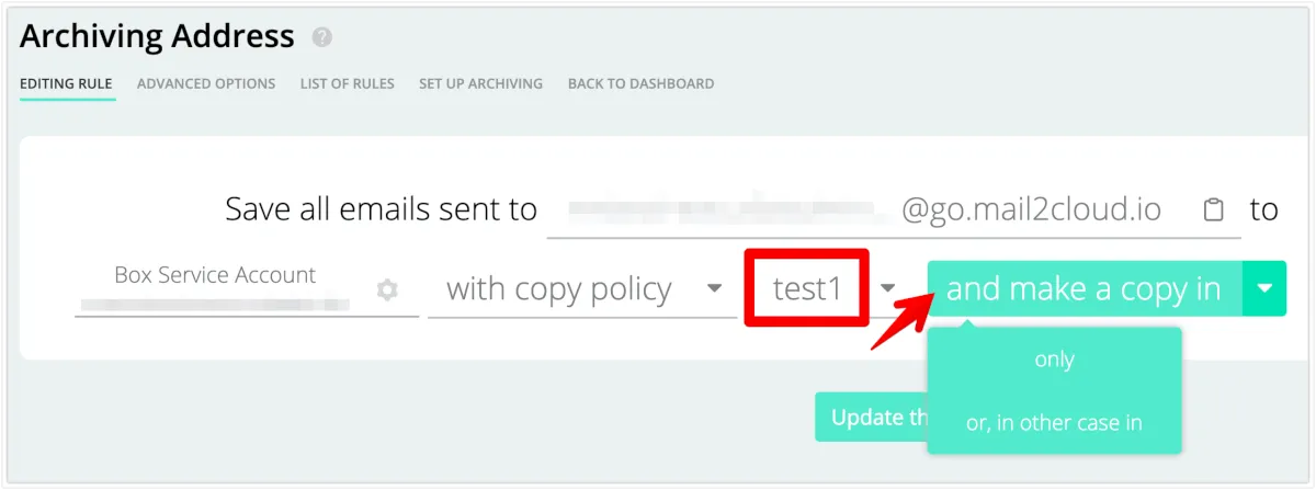 以下の例では、box service accountが設定されているアーカイブルールに、テスト用コピーポリシーを適用する手順を記載しています。