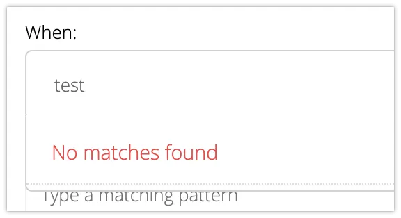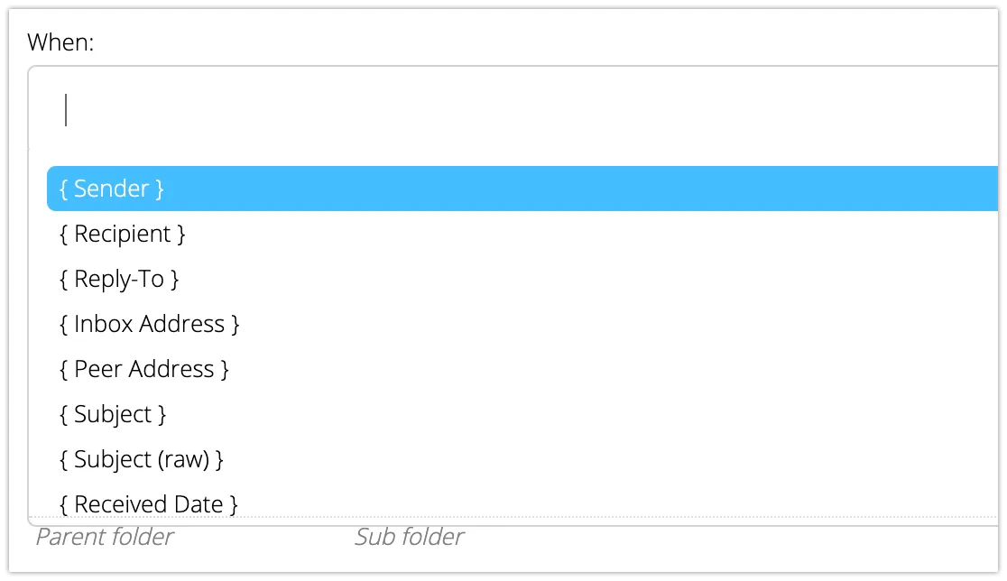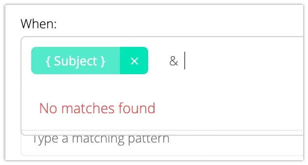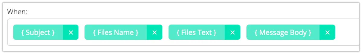 ”When”の部分で、メール内のどこと照合するかを指定します。全て変数で指定する必要があり、直接入力はできません。また、複数設定可能ですが、全て or で評価されます。