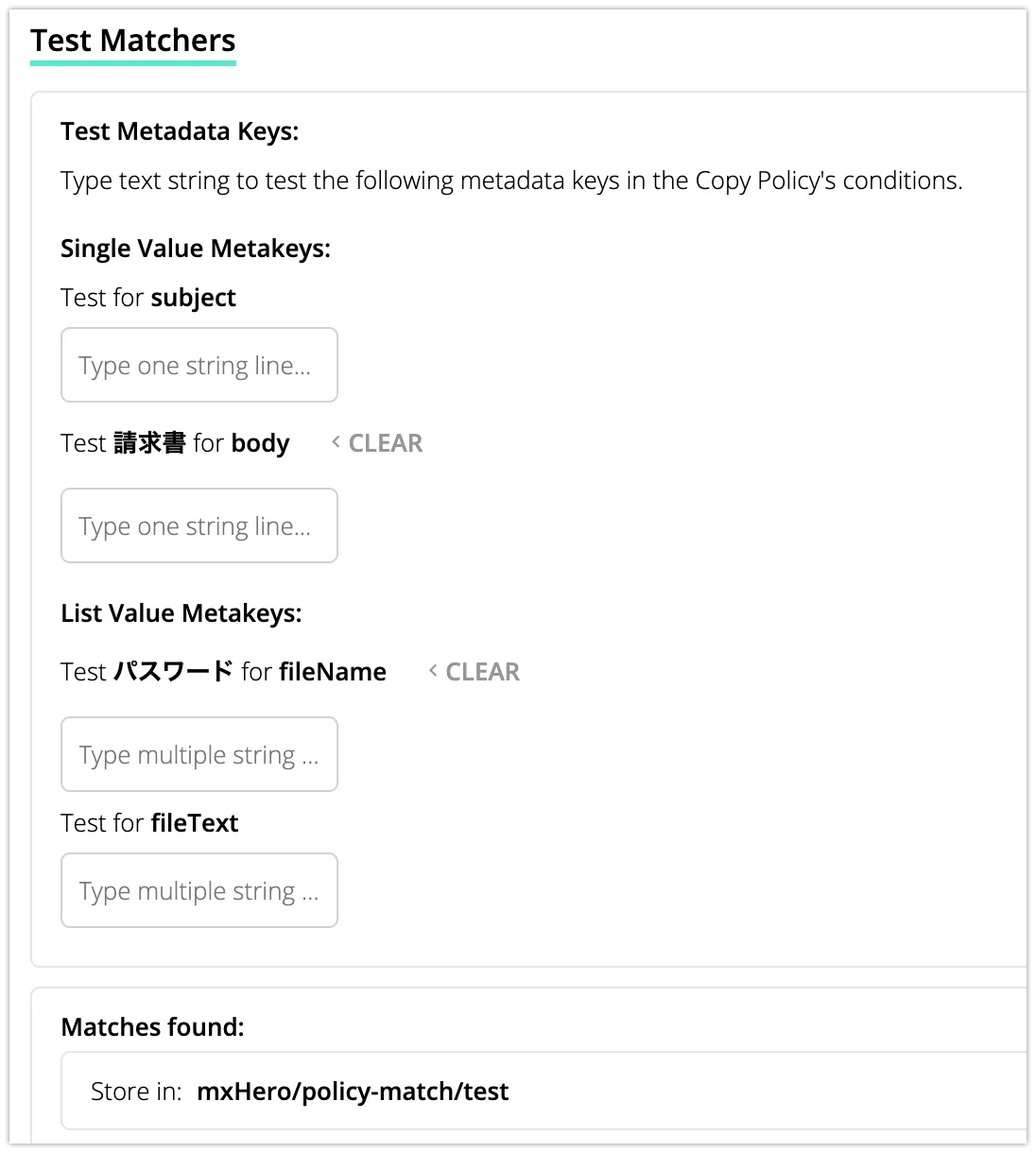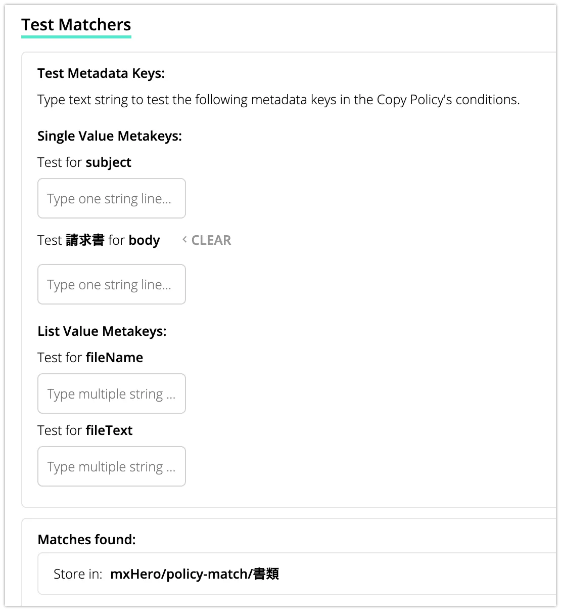 アーカイブルールは以下で、本文も添付ファイルも保存する設定です。また、コピーポリシーは”RETURN ALL MATCHES”で設定しています。