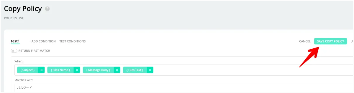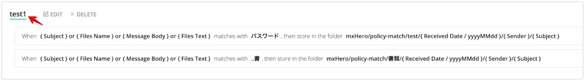 用途としては、契約書、〇〇契約などの特定の文言を検出して、通常のアーカイブ用フォルダとは別のフォルダにコピーされるように設定して、監査を効率化することなどが考えられます。