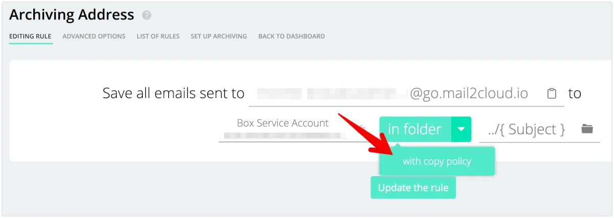 アーカイブのルールを開き、in folder をクリックして、with copy policyを選択します。