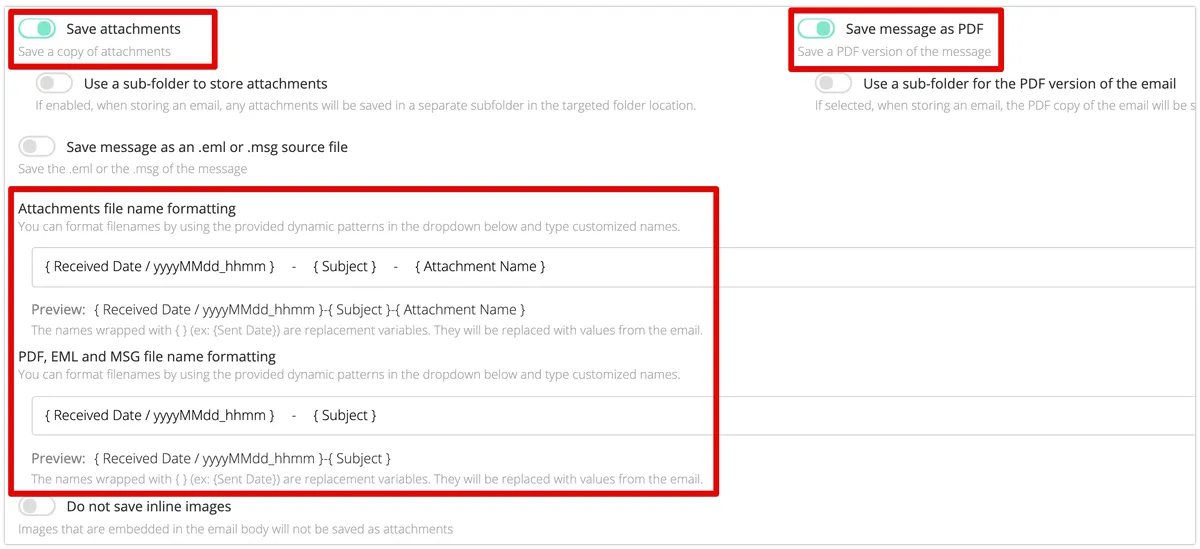 他のルール設定時と同じ要領で、変数で保存先フォルダを指定します。ファイル名については、適用先ルールの設定がそのまま使用されます。