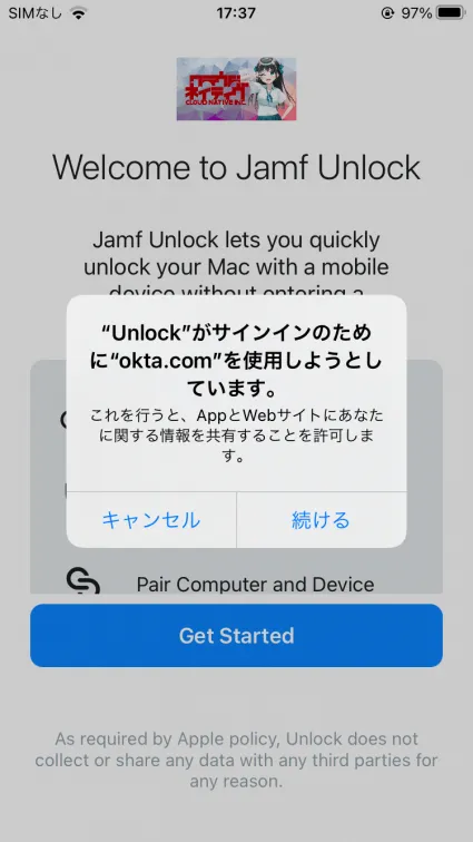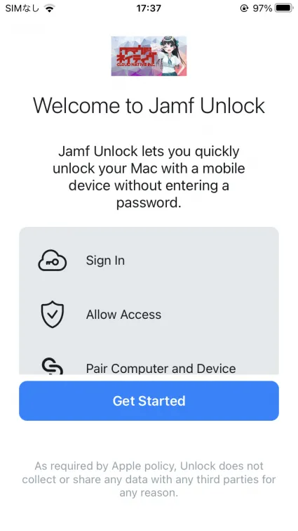 まずiPhone側で配布されたJamf Unlockを開き、”Get Started”から初期設定を行います