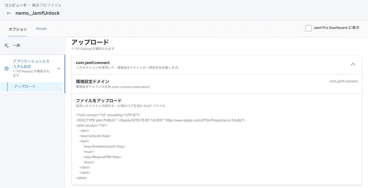 こちらは既存のJamf Connect用の構成プロファイルに追記せず、独立した構成プロファイルとして設定することもできるので今回はJamf Unlock用の設定のみを追加で作成しました。