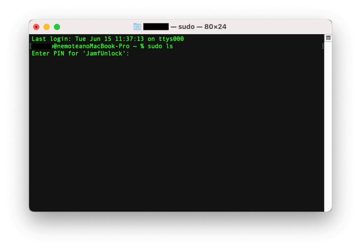 ターミナルからsudoコマンドを実行しようとすると通常パスワードが求められますが、「Enter PIN for ‘JamfUnlock’」と表示が変更されていることが確認できます。