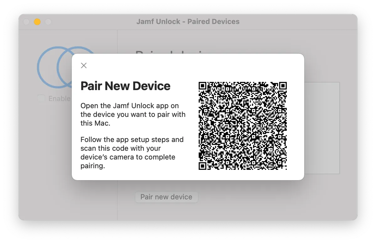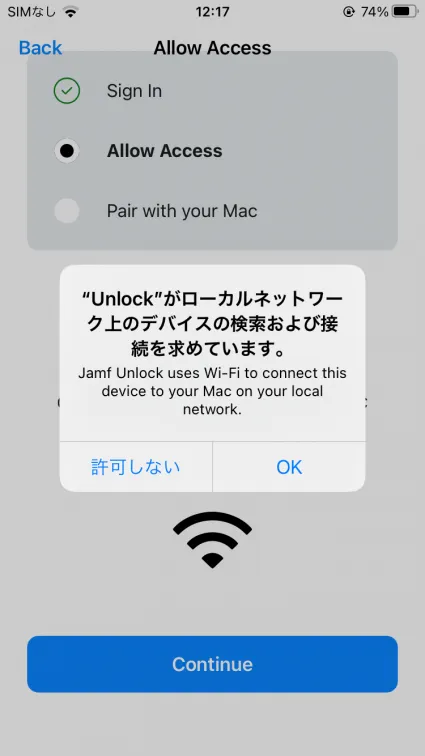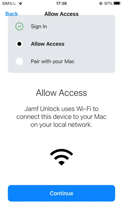 Jamf Unlockは、ユーザーがパスワードを使用せずにモバイルデバイスでMacのロックを解除できるようにするモバイルデバイスアプリです。Jamfロック解除、ユーザーは、ペアとMacとの信頼関係を確立するために使用され、そのデバイス上の身元証明(証明書)を作成したり、生成するセットアッププロセスを完了します。セットアップが完了すると、ユーザーは次のシナリオで代替認証方法としてアプリを簡単に使用できます。
