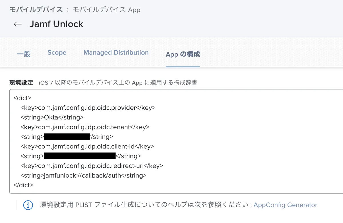 </dict>となっていますが、tenant-nameとabcdqxanb4Rb4veu0h8の部分を自環境のものに置き換える必要があります。tenant-nameはhogehoge.okta.comの場合、hogehogeだけを記述します。abcdqxanb4Rb4veu0h8の部分はOktaの設定の項で設定したJamf Connect用アプリケーションのClient IDと置き換えます。