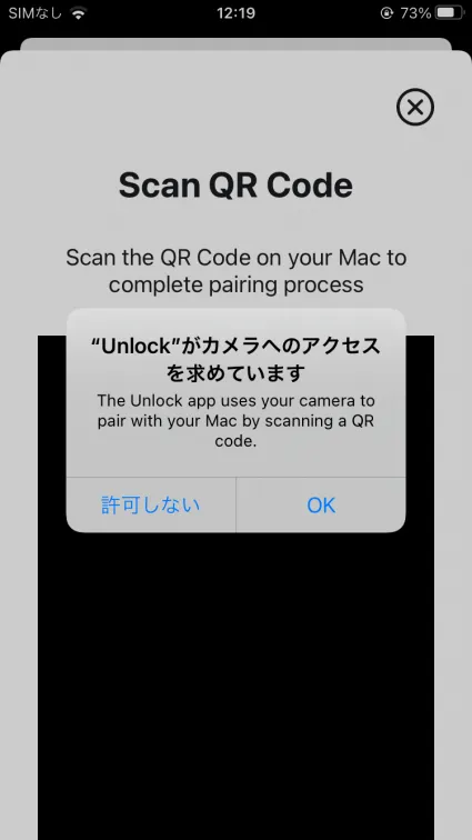 認証が完了するとiPhone側にアプリのアクセス許可を与えるフローに移ります。生体認証もしくはパスコードの利用許可、Wi-Fi検索の利用許可、位置情報サービスの利用許可、カメラへのアクセス許可を求められます。