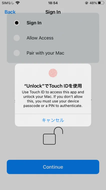プレースホルダーテキスト(パスワードを入力するところ)が「PIN」という表示になっていることが確認できます。この状態でReturnキーを押すとJamf Unlockに通知が飛びます。