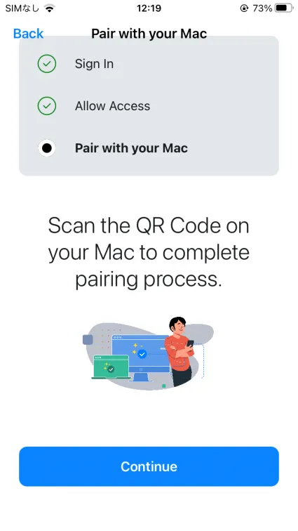 カメラのアクセス許可まで完了するとペアリングさせるためのQRコードを読み込む画面になります。Mac側のJamf ConnectメニューバーAppより、”Paired Devices”を選択します。