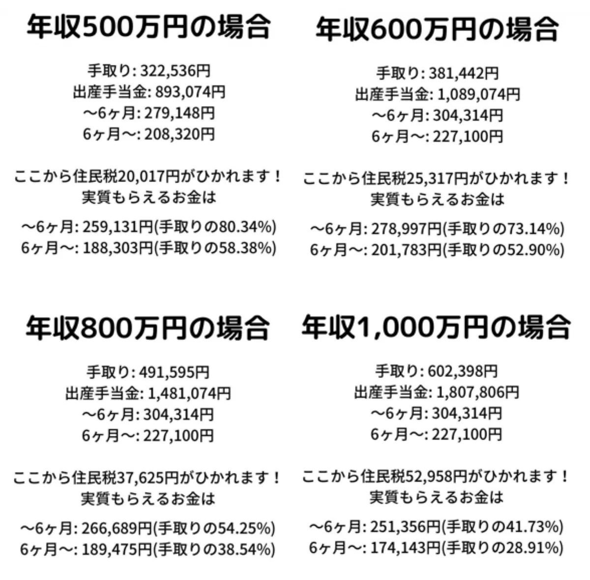 育児休業給付金なんて2ヶ月に一度だし、貰える金額には上限あります!180日まで給料の67%、180日以降も50%も貰えるんだ!と思っていたら、年収550万くらいの人から、上限にひっかかります。社会保険料は免除ですが、住民税を納税の義務があります。ですので、年収が高ければ高いほど育休中に貰えるお金は少なくなります。