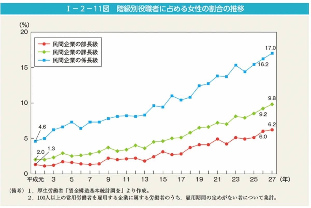内閣府の男女共同参画局のデータによると、常用労働者100人以上を雇用する企業の労働者のうち役職者に占める女性の割合を階級別に見ると、上位の役職ほど女性の割合が低いです。そしてこれだけダイバシティと騒がれながらも、部長の割合が27年で4.9%しか上昇をしていません。(詳細はこちら)