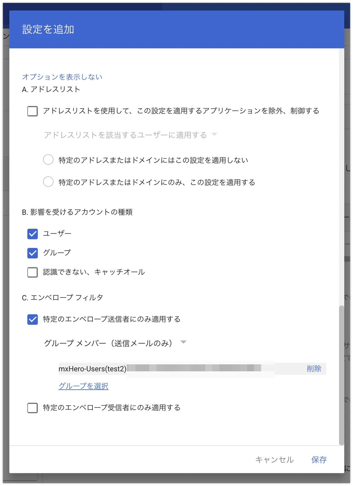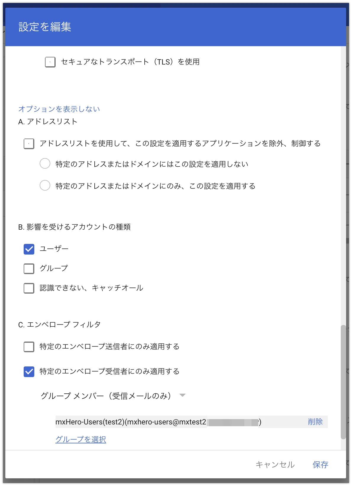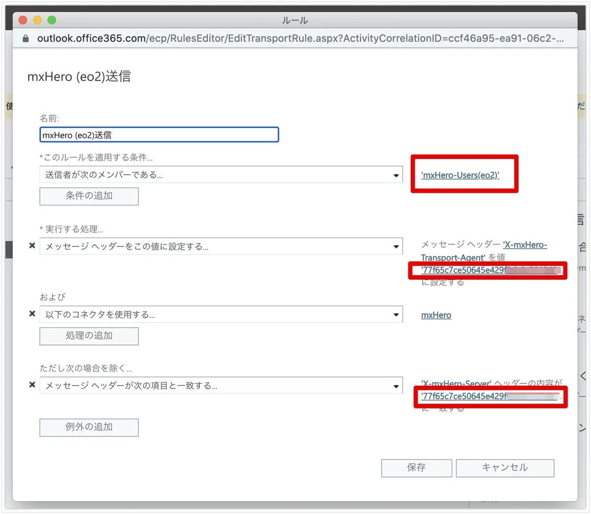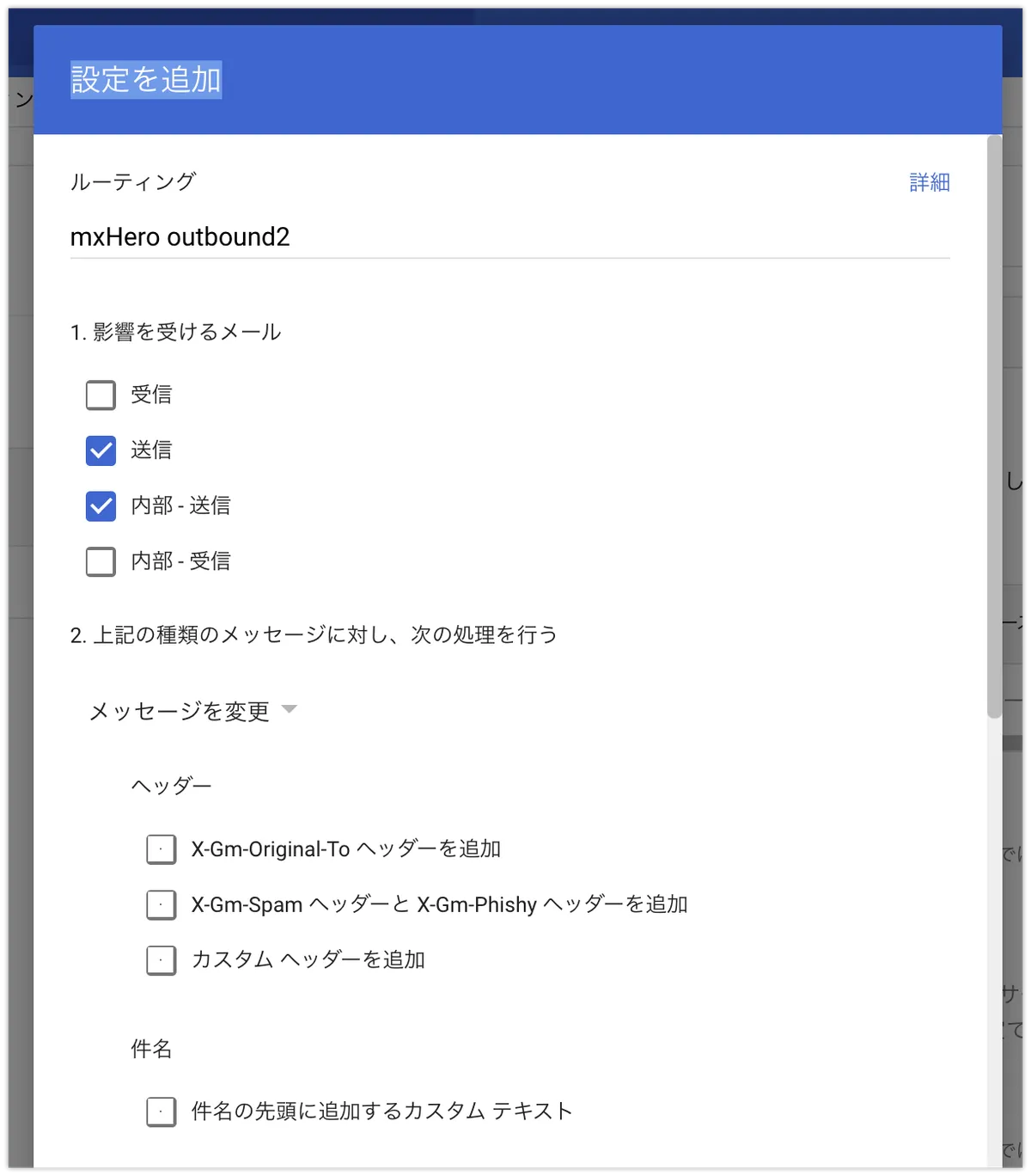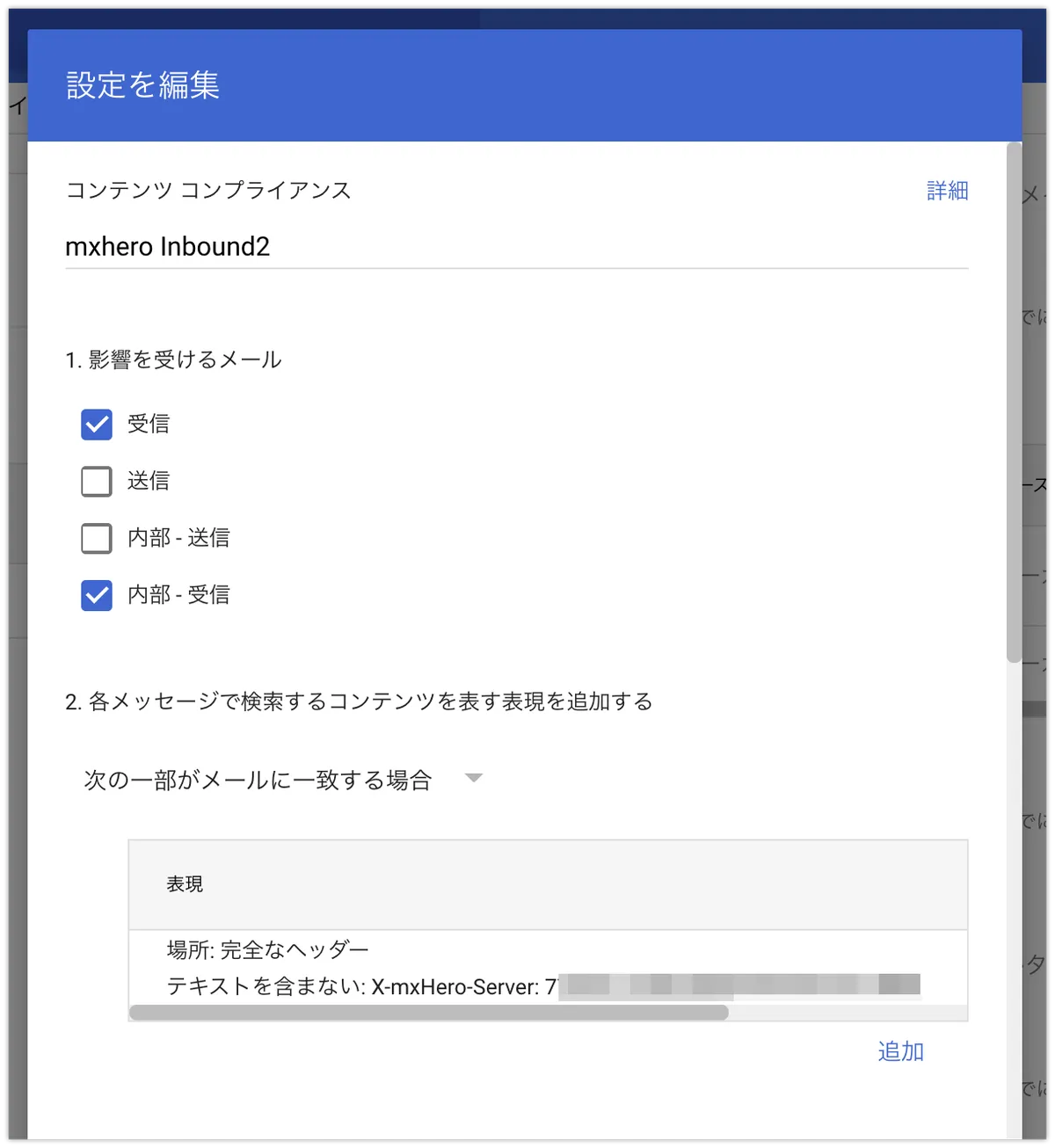 コピーしたルールを送信受信それぞれ編集します。なお、以下の画像は送信の例です。編集する箇所は、ルールの適用条件・実行する処理・除外条件です。