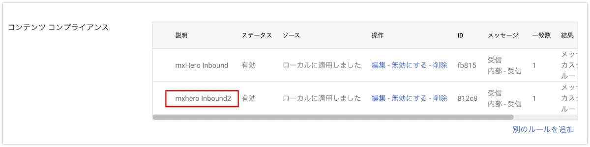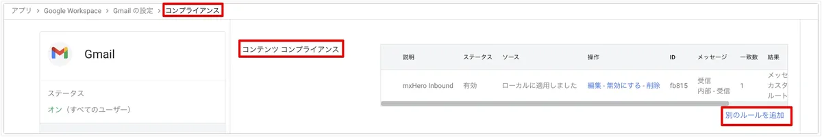 次に、GoogleWorkspaceの管理画面に戻り、”コンプライアンス”から、”コンテンツコンプライアンス”へ移動し、”別のルールを追加”します。
