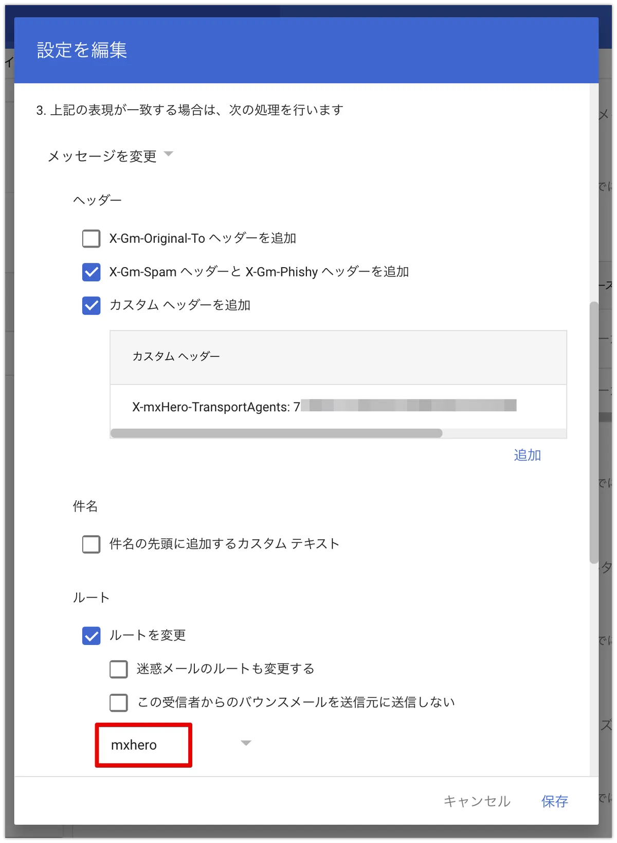 ヘッダに設定する値は、既存のものではなく、今回生成したTransport agentです。