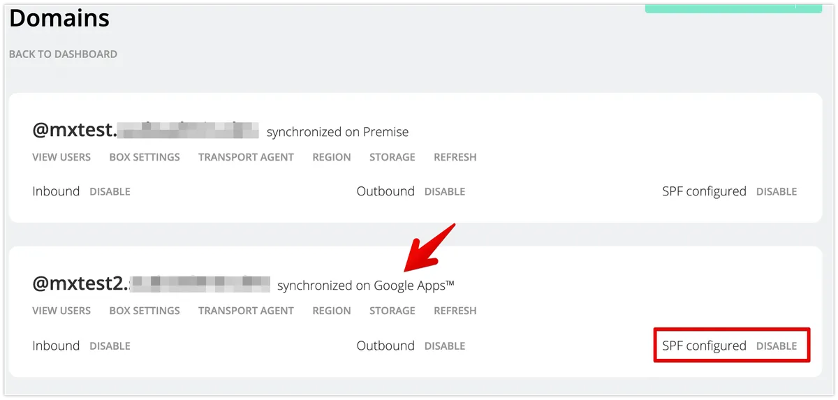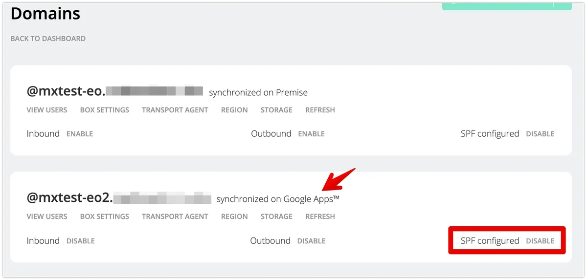 次に、追加ドメイン分のSPF(TXT)レコードの追加を行い、DISABLEに変化したことを確認します。このとき、”SPF configured” の表示以外の2点は無視してください。送信可能でもDISABLEと表示された状態のままになります。 この状態でも、送受信に支障はありません。