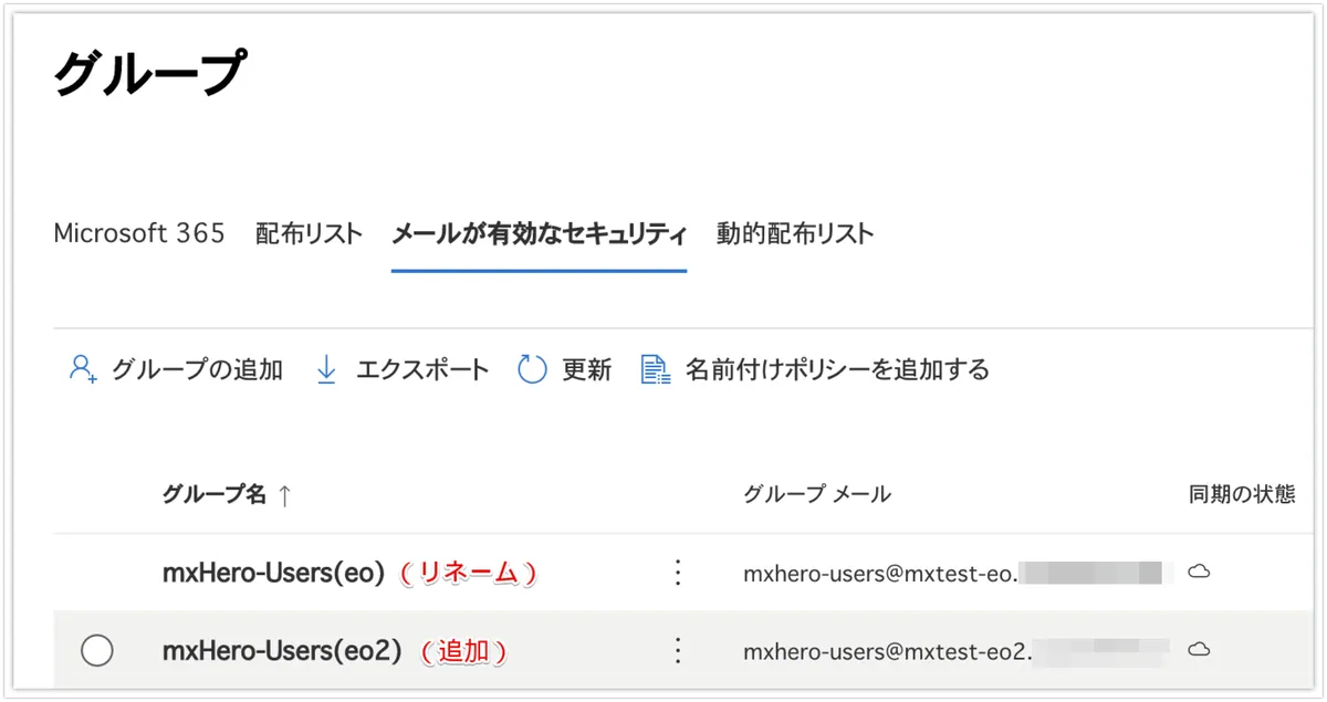 Exchange Online側で追加ドメイン分のグループを作成し、既存グループを識別のためリネームします。