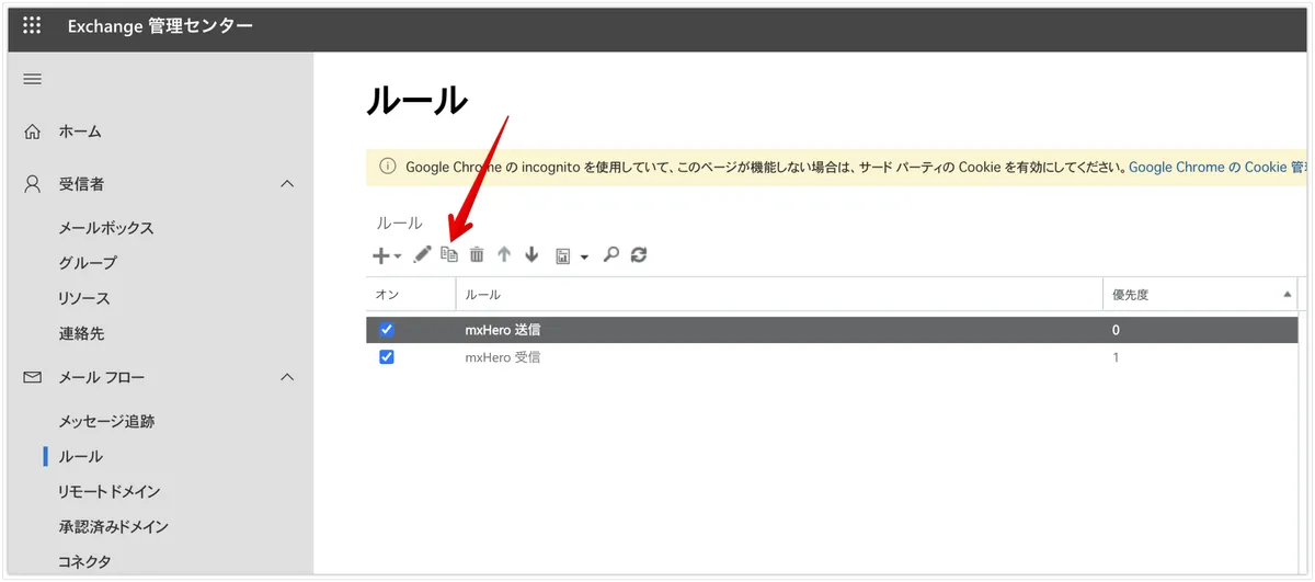 次にExchange Onlineに戻り、既存のルールを送信受信それぞれコピーして設定していきます。なお、コネクタは分ける必要がありませんので、作成しません。