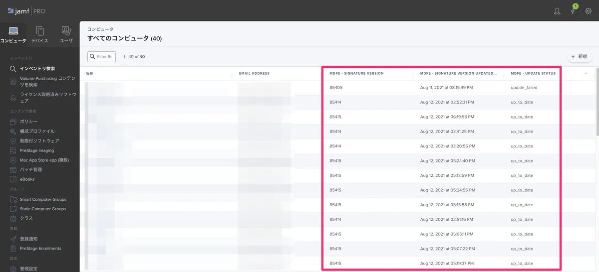 - 「1. 拡張属性を登録する」で登録した拡張属性は、上記の[検索]を押下して遷移した画面で、現在のSignature Versionやアップデート状況を確認することができました。