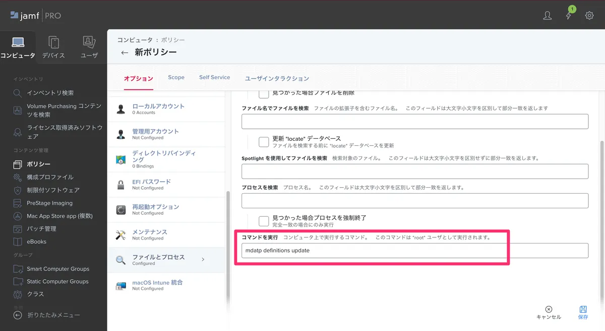 上記の画像のように、アップデートが失敗している端末に対しては、その端末のコマンドラインで mdatp definitions update を実施することで、アップデートを再実行することができます。また、端末が手元にない場合にJamf Proで実行する際は、以下の手順で実施することができます。