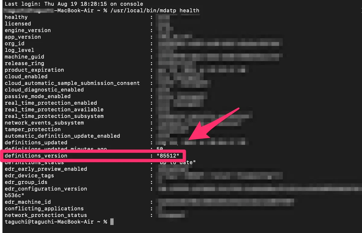 macOSにおけるMicrosoft Defender ATP のSignature Versionは個別の端末にて、/usr/local/bin/mdatp health のコマンドを叩くことで、取得することは可能です。