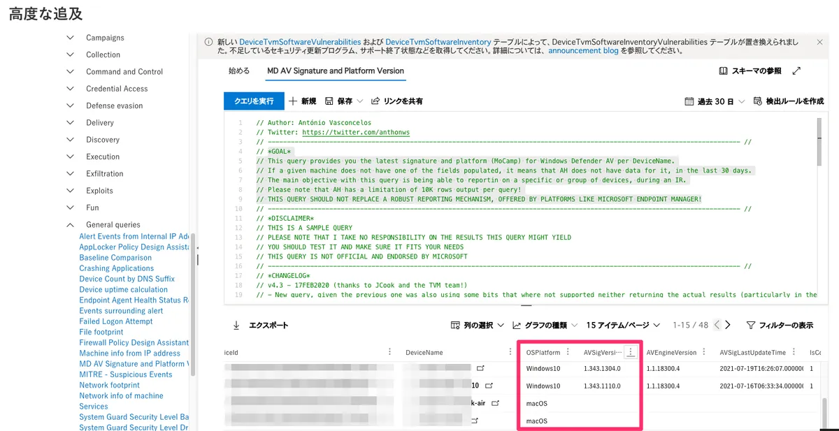 - [Queries] > [Shared Queries] > [Community] > [Genaral Queries] > [MD AV Signature and Platform Version]の順に選択した後に表示されるクエリを実行する。