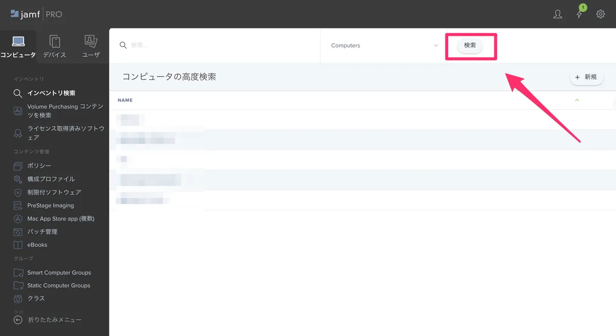 - Jamf Proの[コンピューター]タブのトップ画面[検索]を押下する。(検索窓には何も入力しない。)