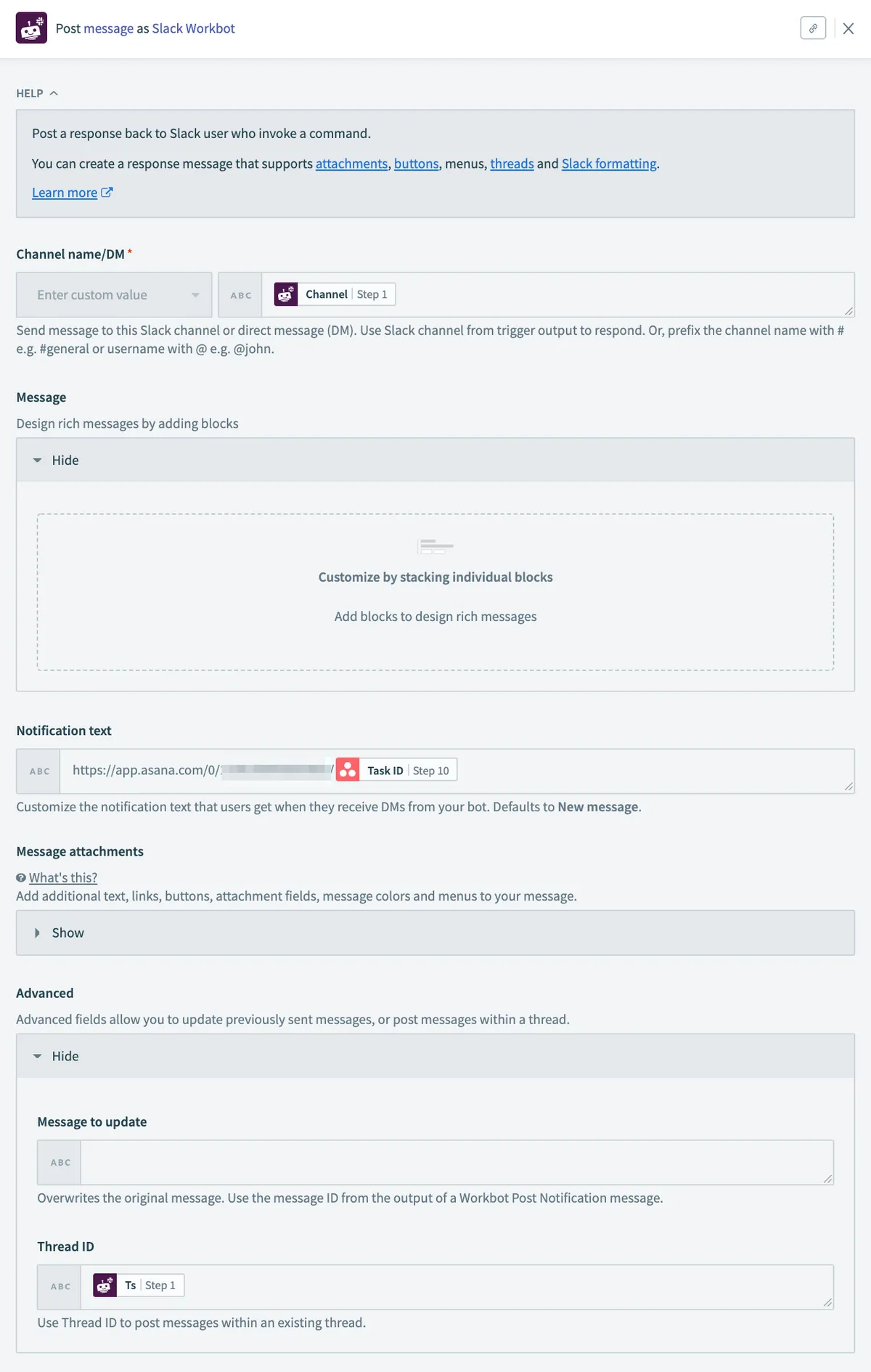 - 特定のチャンネルで動作する場合、特定のAsanaボードにタスクを追加