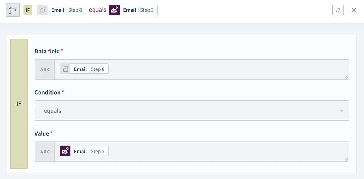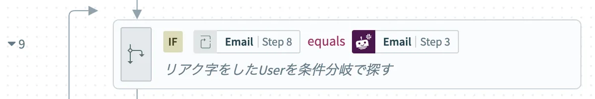 - ループされたユーザーのEmailとステップ3で取得したリアクションしたユーザーのEmailで一致するか条件分岐を使って探すため