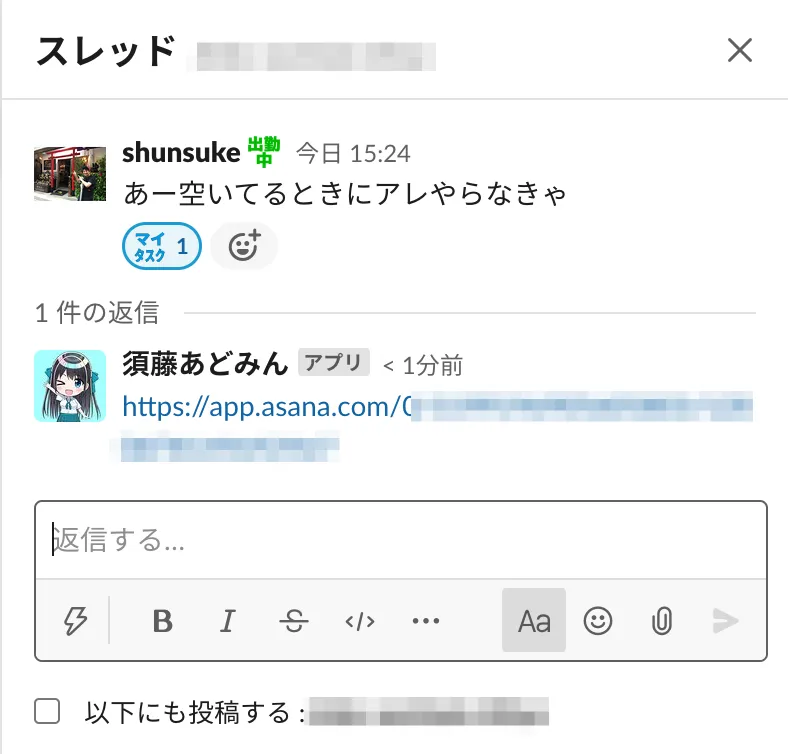 - Slackの対象メッセージのスレッドにURLをはかせる(自動)